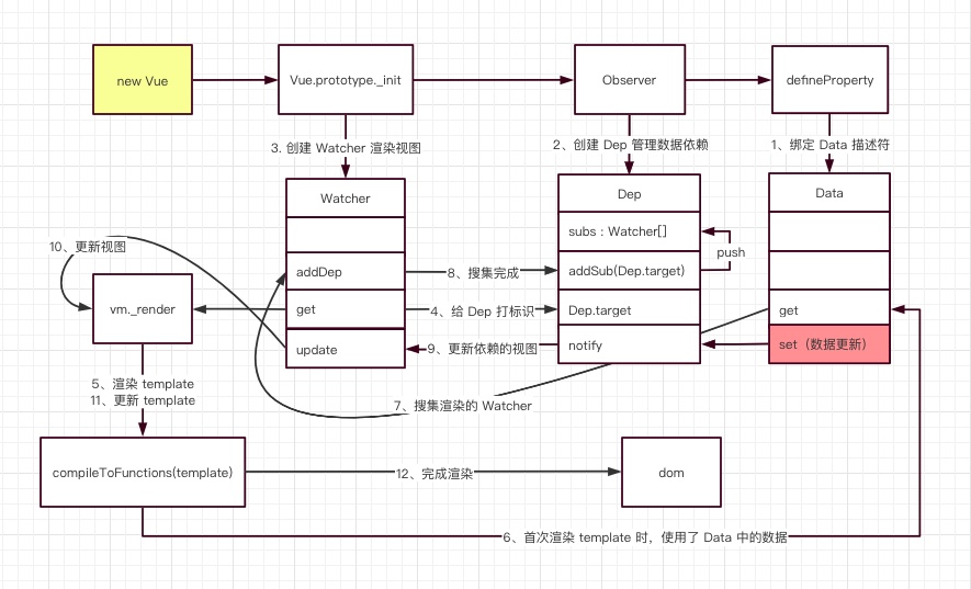 // 12. vm.__patch__ 方法就是做的 dom diff 比较,然后更新 dom,这里就不展开了。到这里,我们就知道了 Watcher 其实是在 Vue 初始化的阶段创建的,属于生命周期中 beforeMount 的位置创建的,创建 Watcher 时会执行 netder 方法,最终将 Vue 代码渲染成真实的 DOM。