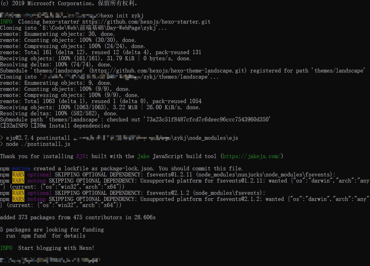 这样就代表创建成功。但是发现npm报警告(注意:在windows环境,所以可以忽略这个警告、如果是其他系统、可以通过查阅资料解决。)